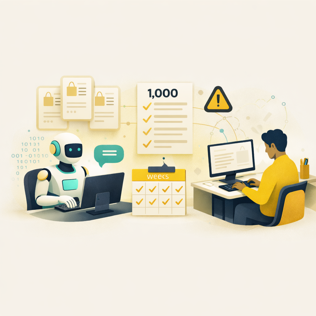 Pierwsza myśl wielu właścicieli sklepów jest prosta: wkleję opis producenta do ChatGPT i poproszę o przepisanie. I to faktycznie działa — ale tylko dla pierwszych kilku produktów. Gdy masz 1 000 produktów, ręczne kopiowanie i wklejanie to wciąż setki godzin pracy. Poza tym wynik jest nierówny: jeden opis wychodzi świetnie, inny – banalnie, kolejny — zupełnie nie pasuje do tonu marki. Bez struktury i kontroli jakości dostajesz 1 000 opisów o różnej jakości, z których wiele nie nadaje się do publikacji.